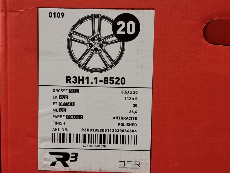 4ks německých alu kol R3 WHEELS, model R3H01 - rozměr 8,5×20" - rozteč 5x120 - ET 35 - středová díra 72,6mm - vyšší nosnost kol = 730kg / kolo. - KBA certifikace 50739 (možnost zápisu kol do TP). - kola jsou nová a nejetá, zabalená v originálních krabicích. - kola jsou v leskle antracitovém provedení s leštěnými čelními plochami (Anthracite Polished)