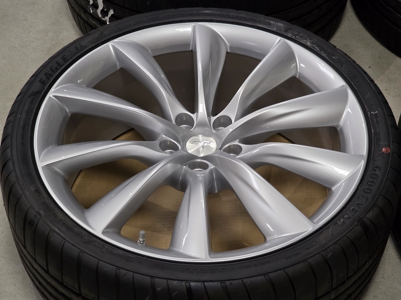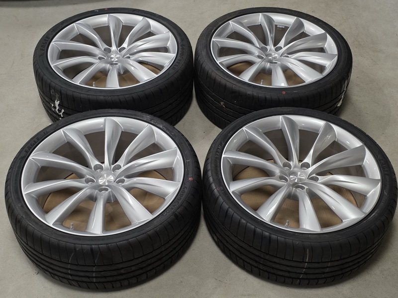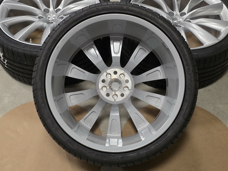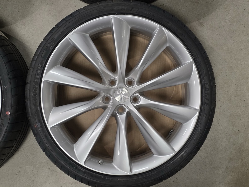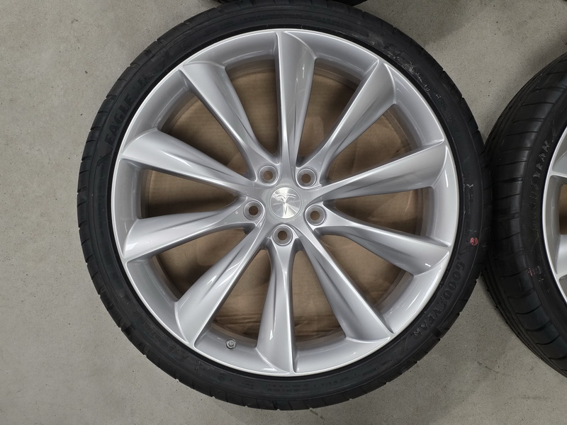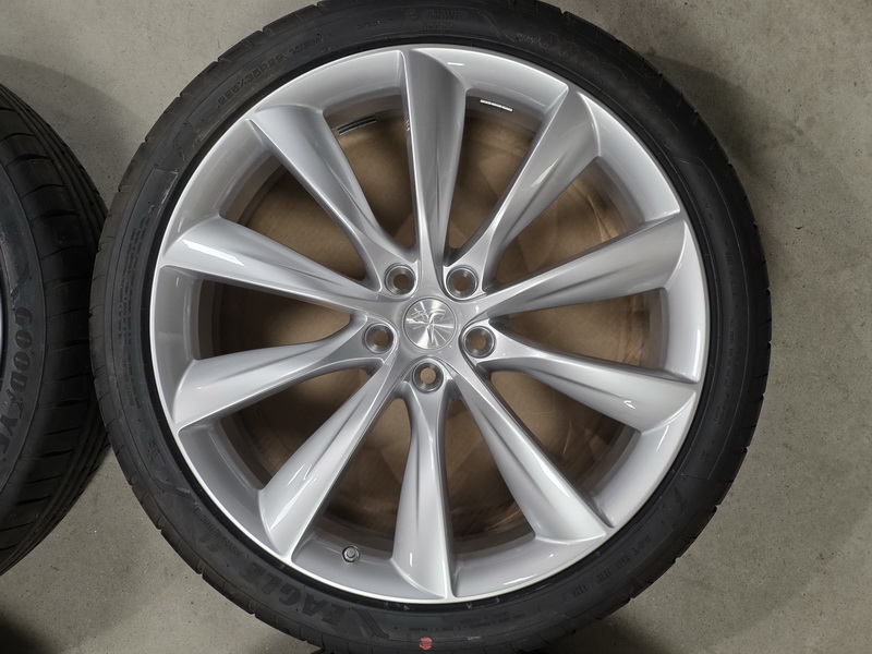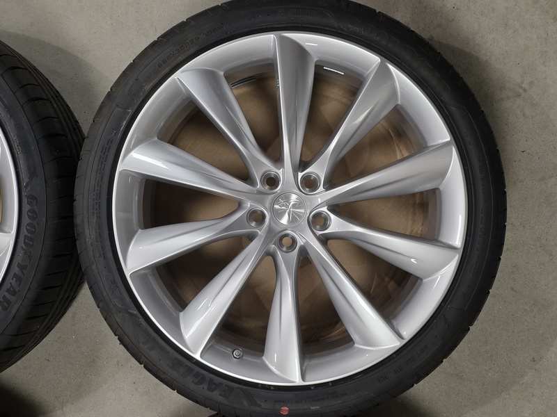 4ks originálních alu kol TESLA Model X, typ Turbine - rozměr 9x22" (přední) a 10x22" (zadní) - rozteč 5x120 - ET 35 - středová díra 64,1mm. - včetně letních pneu GOOD YEAR Eagle F1 Asymmetric 3 v rozměru 265/35 R22 102W (přední) a 285/35 R22 106W (zadní), vyrobených v roce 2020. - včetně originálních TPMS senzorů tlaku v pneu. - kola i pneu jsou nová a nejetá. - kola jsou v leskle stříbrném provedení. - číslo originálního dílu TESLA = 1027246-XX-C (přední) a 1027247-XX-C (zadní) .