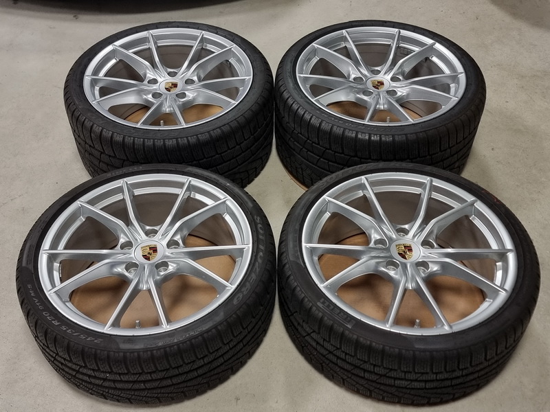4ks originálních alu kol PORSCHE 911 (991.2), model Carrera S. - rozměr 8,5×20" (přední) a 11x20" (zadní) - rozteč 5x130 - ET 49 (přední) a 56 (zadní) - středová díra 71,6mm - včetně zimních pneu PIRELLI Sottozero v rozměru 245/35 R20 91V (přední, vzorek 7,4mm) a 295/30 R20 97V (zadní, vzorek 7,1mm), vyrobených v září 2017. - včetně TPMS senzorů tlaku v pneu. - kola jsou naprosto rovná, dvě kola mají drobné oděrky laku na hraně. - kola jsou v leskle stříbrném provedení (Brilliantchrom Metallic - 88Z). - číslo originálního dílu PORSCHE = 991.362.710.00 (99136271000) a 991.362.760.03 (99136276003).