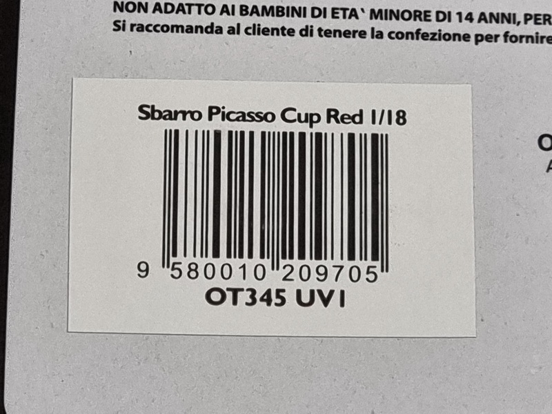 Sbarro Picasso Cup - rok výroby vozu: 2002 - výrobce modelu: OttO Mobile - měřítko: 1:18 - materiál: resin - barva: červená (Rouge) - limitovaná edice: 3000ks - vydání modelu: leden 2021 - číslo produktu: OT345 Přestavba minivanu na soutěžní auto? To byla hodně zvláštní představa! A přesto to Franco Sbarro udělal. Po několika konceptech založených na modelech Renault Espace a Volkswagen Sharan se designér automobilů pustil do Citroënu Picasso. Po verzi Citroën „El Bicho“ uvedla dílna Sbarro „Picasso Cup“: závodní verzi minivanu vybaveného čtyřválcovým motorem o výkonu 250 koní z vozu Peugeot 306 S16. Interiér pojal „závodní“ palubní desku a také 4 skořepinové sedačky. Z vnějšku kromě rozšiřovací sady a 19palcových ráfků vyniká Sbarro Cup jasnými červenými a křídlovými dveřmi Citroën Racing.
