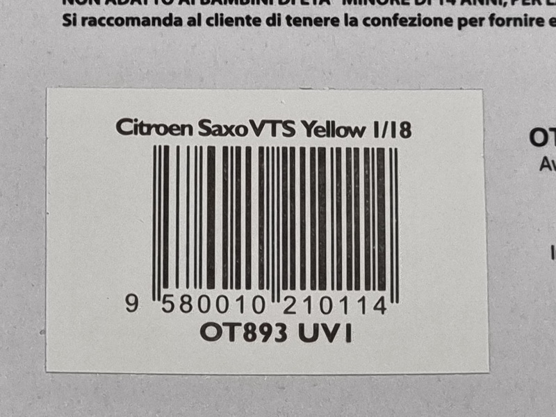 Citroën Saxo VTS - rok výroby vozu: 2000 - výrobce modelu: OttO Mobile - měřítko: 1:18 - materiál: resin - barva: zlatá (Jaune Heliodor) - limitovaná edice: 2000ks - vydání modelu: n/a - číslo produktu: OT893 Citroën Saxo VTS (pro Tonic Sports Vehicle) je přeplňovaná verze poměrně nevýrazného městského auta, uvedeného na trh v létě 1996, pár měsíců po své základní verzi. Výsledkem bylo lehké auto poháněné motorem 1,6 l s výkonem 120 koní vypůjčeným od svého bratrance, Peugeotu 106 S16. To stačilo k nabídnutí pěkné malé motokáry, která nechala zbytečnosti stranou ve prospěch jedinečného zážitku z jízdy! V dnešní době je Saxo VTS vzácné a zůstává velmi oblíbené u fanoušků francouzské značky.