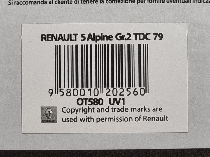 Renault 5 Alpine Group 2 Tour de Corse - rok výroby vozu: 1979 - výrobce modelu: OttO Mobile - měřítko: 1:18 - materiál: resin - barva: #6 Tour de Corse 1979 - limitovaná edice: 2000ks - vydání modelu: leden 2015 - číslo produktu: OT580 .