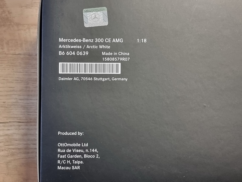Mercedes-Benz W124 300 CE AMG Widebody - rok výroby vozu: 1988 - výrobce modelu: OttO Mobile - měřítko: 1:18 - materiál: resin - barva: bílá (Arctic White) - limitovaná edice: 1967ks - vydání modelu: n/a - číslo produktu: B66040639 .
