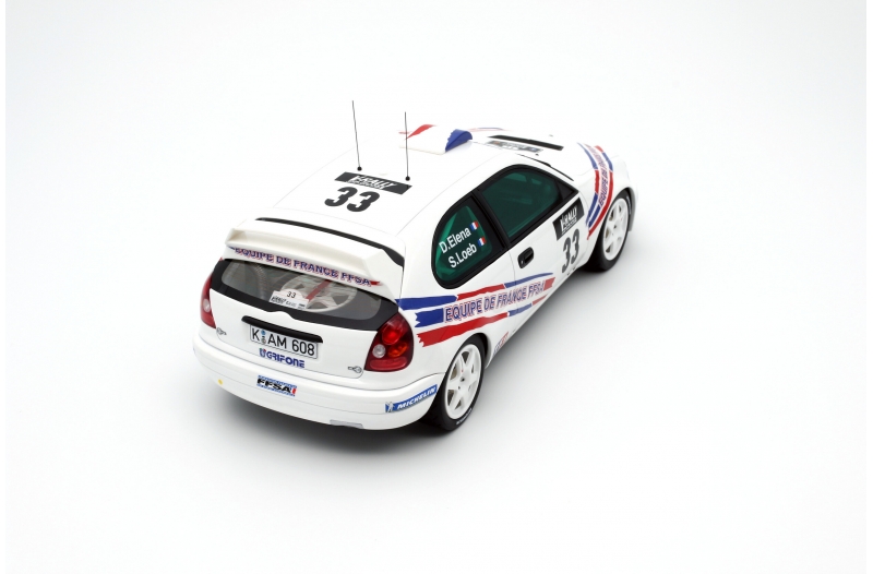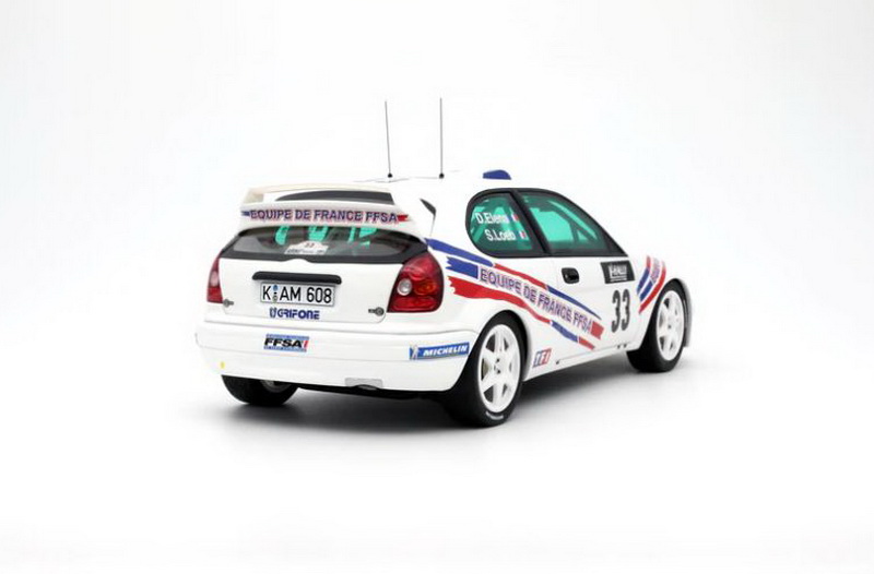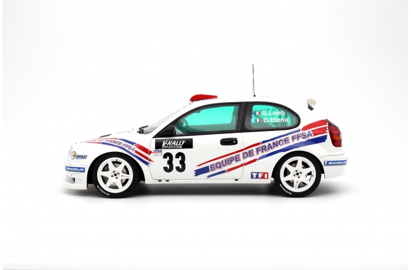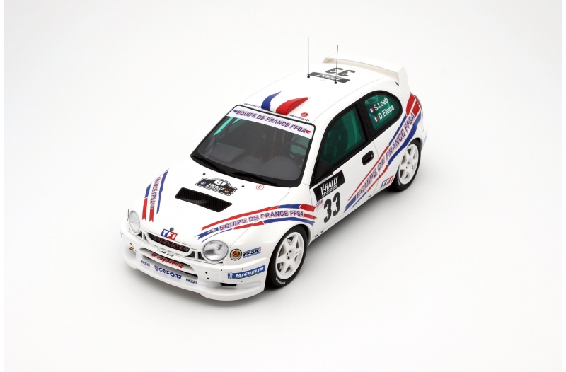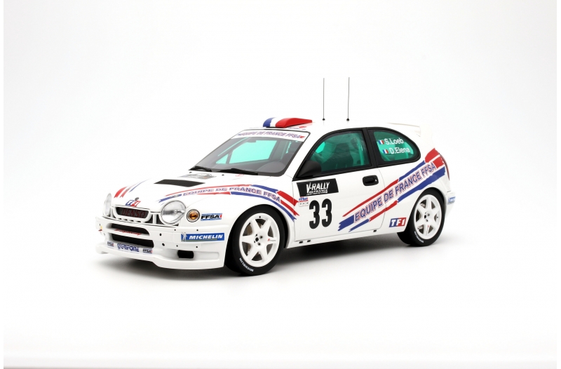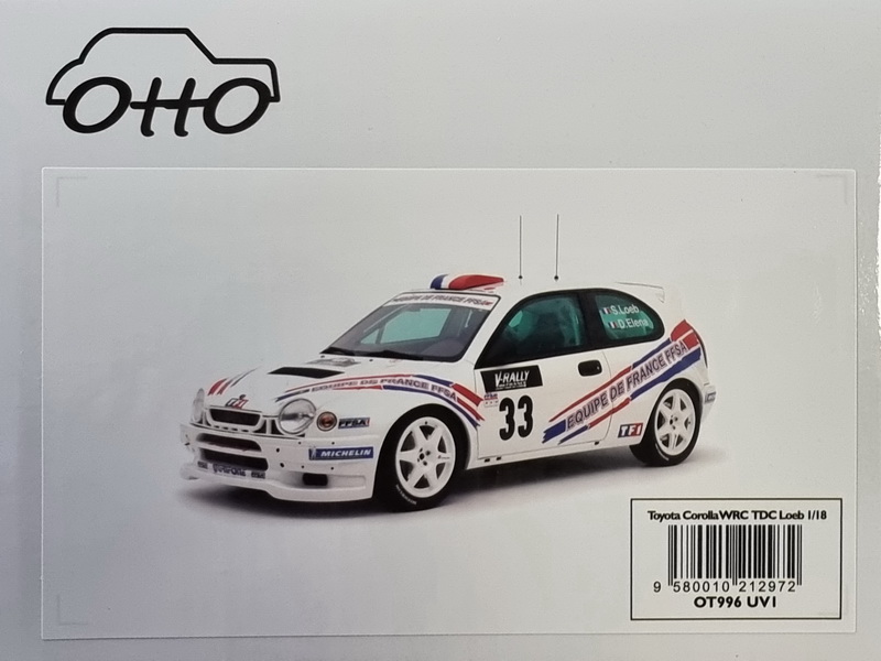 Toyota Corolla WRC - rok výroby vozu: 2000 - výrobce modelu: OttO Mobile - měřítko: 1:18 - materiál: resin - barva: #33 Sébastien Loeb - limitovaná edice: 3000ks - vydání modelu: květen 2023 - číslo produktu: OT996 Na začátku sezóny 2000 neměl Sébastien Loeb žádný rozpočet. S pomocí J.P. Champeaua nakonec vstoupil do francouzského šampionátu Gravel Rally. Výsledek byl velmi dobrý, protože vyhrál šampionát v kategorii vozů s pohonem 2 kol za volantem Citroënu Saxo Kitcar. Pro mnohé byl považován za jednu z největších nadějí francouzské rallye. V důsledku toho a v rámci jeho partnerství s týmem France FFSA bylo přijato rozhodnutí umožnit Loebovi ochutnat WRC za volantem vozu WRC! Debutoval ve světové elitě za volantem Toyoty Corolla WRC (vozu, který vyhrál v roce 1999 China Rally s Didierem Auriolem za volantem). Na Tour of Corsica a poté na Rally San Remo vytvořil Sébastien Loeb senzaci, když pokaždé skončil v top 10! Tyto výsledky zapsaly tuto Corollu WRC v barvách FFSA do historie WRC i Sébastiena Loeba.