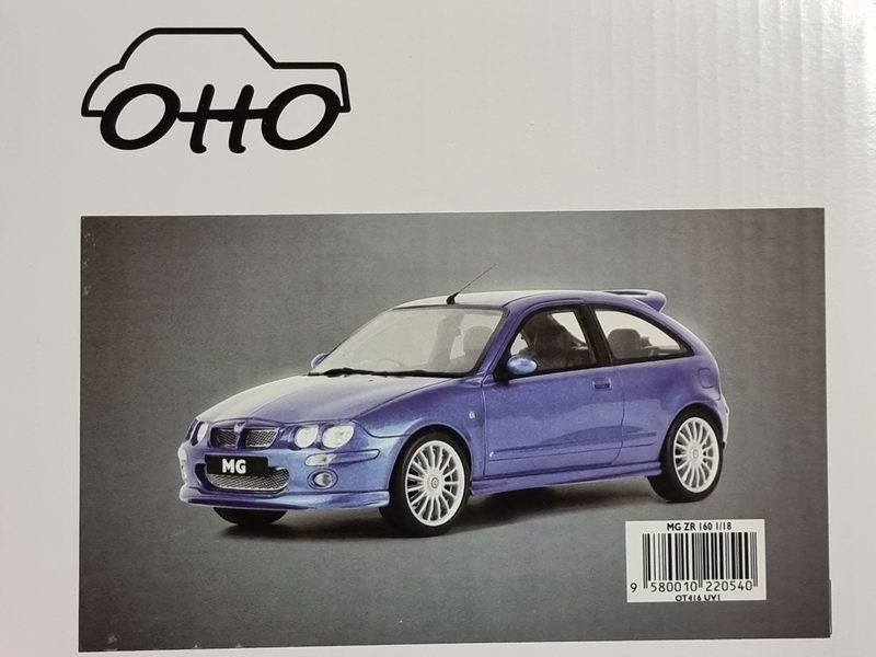 MG ZR 160 - rok výroby vozu: 2001 - výrobce modelu: OttO Mobile - měřítko: 1:18 - materiál: resin - barva: modrá (Trophy Blue JVF) - limitovaná edice: 2000ks - vydání modelu: červenec 2023 - číslo produktu: OT416 ZR je malý kompaktní sedan vyrobený britským výrobcem MG na počátku 21. století. Toto malé auto založené na Roveru 25 mělo sportovnější vzhled. Použit byl motor K-series z Roveru o výkonu 160k, odtud název ZR 160. Tento „100% britský“ výtvor nabízí poměrně slušný výkon s maximální rychlostí 208 km/h a zrychlením z 0-100 km/h za 7,9 s. Svou nízkou hmotností dává řidiči okamžitě najevo svůj sportovní charakter. MG ZR 160 znají dokonce i fanoušci rallye, protože na počátku roku 2000 závodil v kategorii Super1600 ve WRC, ale výsledky dosažené jeho jezdcem Gwyndafem Evansem spolu s nedostatečnou spolehlivostí z něj nedělají šampiona.