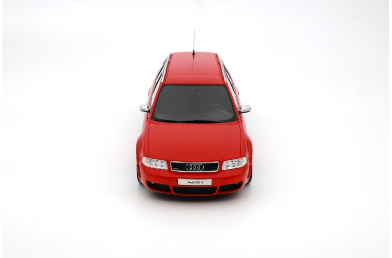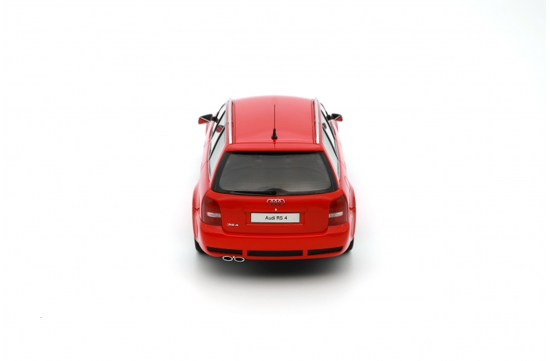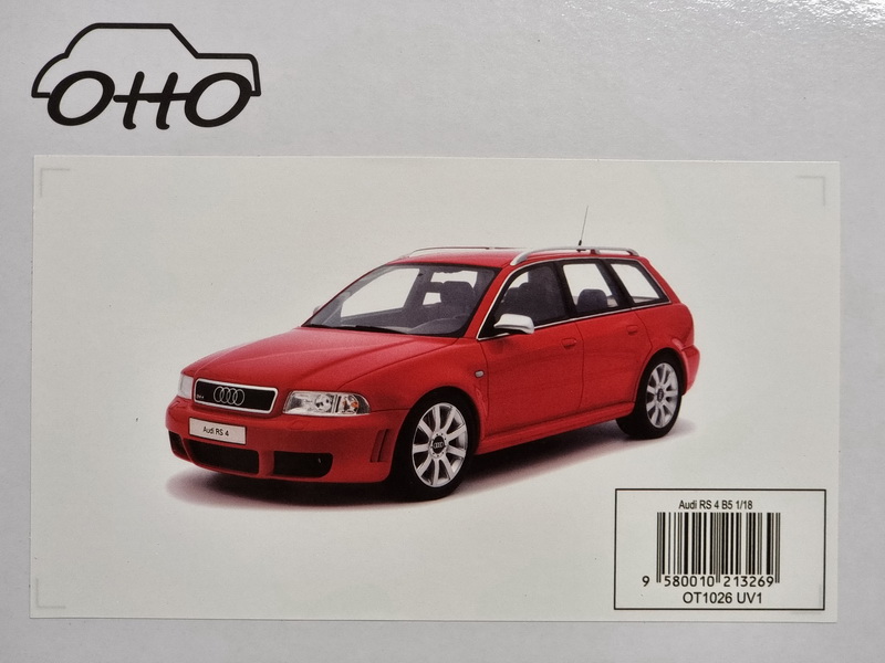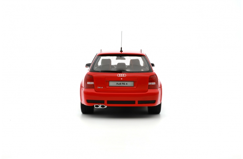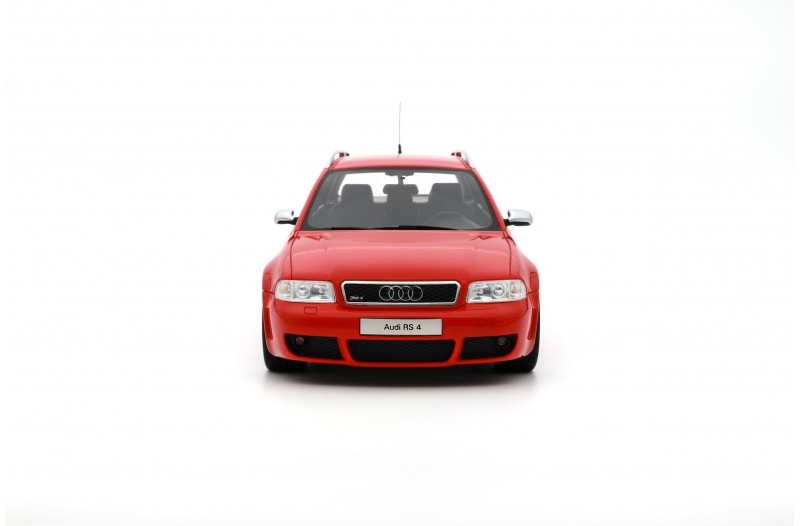 Audi RS4 Avant B5 - rok výroby vozu: 2000 - výrobce modelu: OttO Mobile - měřítko: 1:18 - materiál: resin - barva: červená (Misano Red) - limitovaná edice: 2000ks - vydání modelu: říjen 2023 - číslo produktu: OT1026 Je to důstojný potomek Audi RS2 Avant, které zahájilo módu supersportovních kombi. Audi RS4 bylo uvedeno na trh v roce 2000 a rychle se stalo měřítkem ve své kategorii. Model RS4 B5 byl prodáván výhradně ve verzi Avant. Vyvinutý s firmou Cosworth Technology byl v dílnách Quattro Gmbh montován ručně rychlostí 20 kusů za den. Jeho motor 2.7 V6 biturbo dosahuje výkonu 380 koní, které se přenášejí na pohon všech čtyř kol. Z 0 na 100 km/h zrychlí za 4,9 sekundy! Celkem spatřilo světlo světa 6030 kusů tohoto superkombíku.