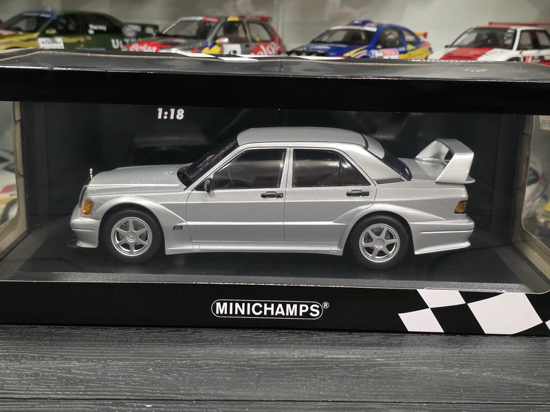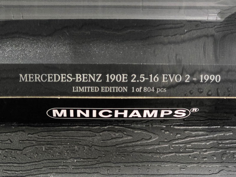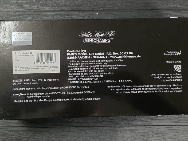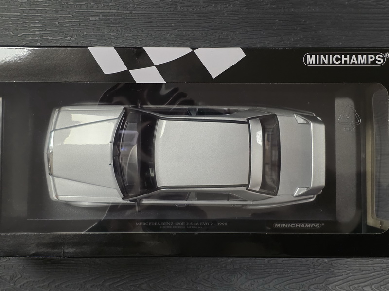 Mercedes-Benz 190E 2,5-16 Evo II - rok výroby vozu: 1990 - výrobce modelu: Minichamps - měřítko: 1:18 - materiál: kovový model s otevíratelnými díly - barva: stříbrná (Silver) - limitovaná edice: 804ks - vydání modelu: n/a - číslo produktu: 155036101 .